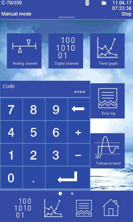 In this header the button for the service area must be pressed. After pressing, a numeric keypad appears for entering a code.